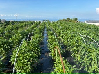 ギラギラ照りつける太陽の下、普賢岳と有明海に挟まれた畑では唐辛子が青々と実っています☀️☀️☀️