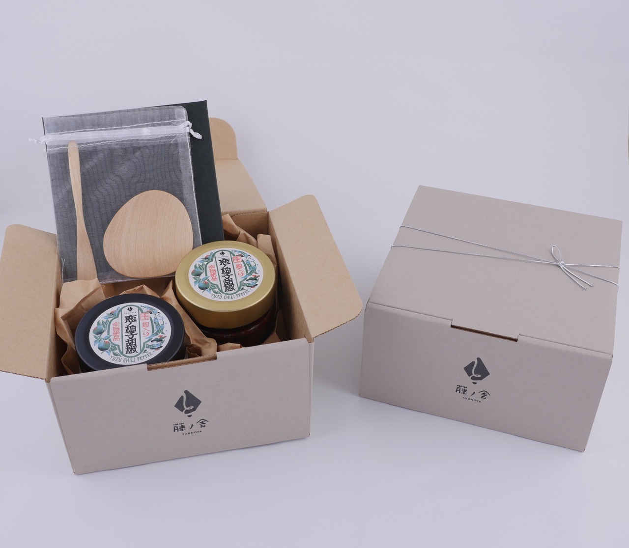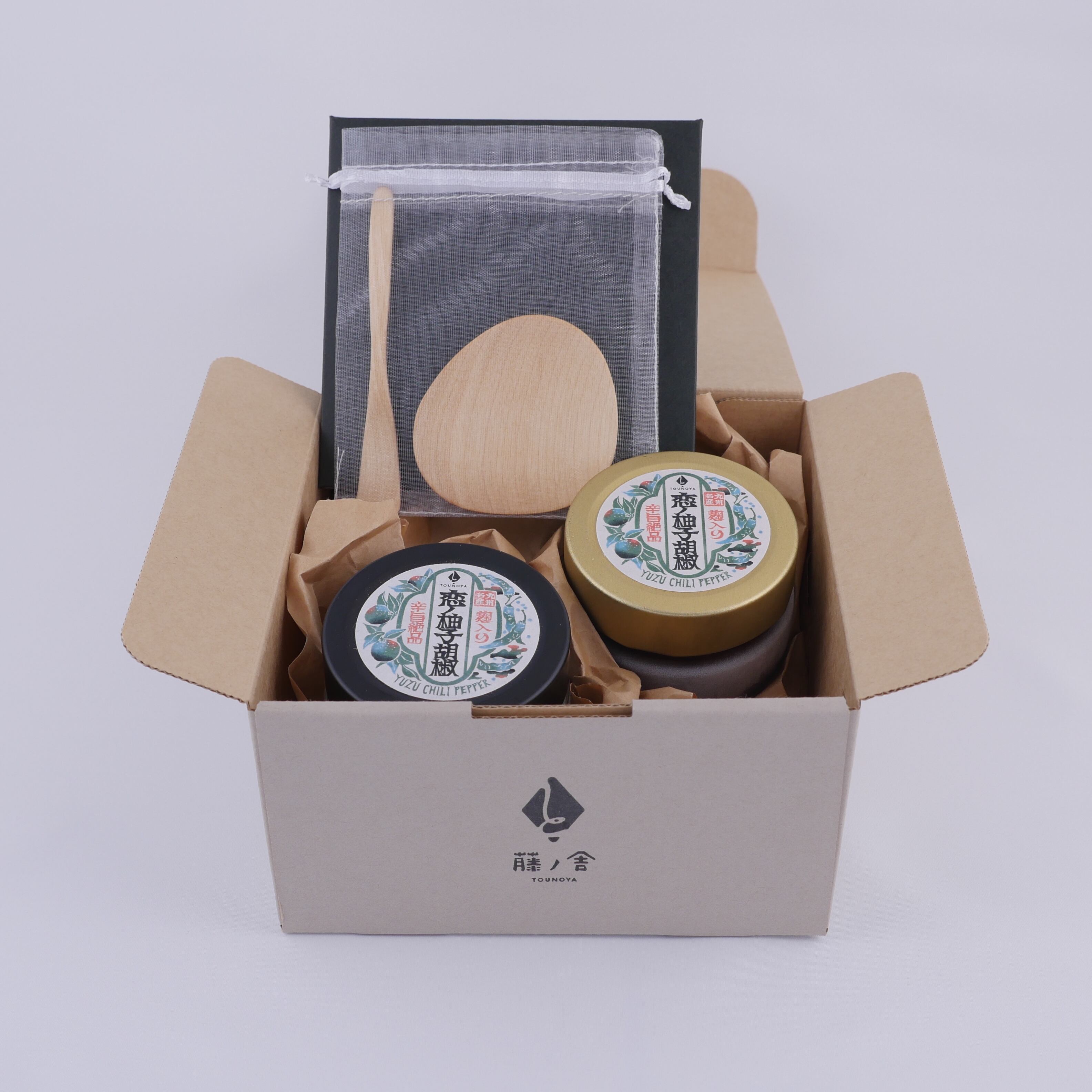 柚子胡椒2個(恋ノ柚子胡椒「定番」「紅恋」)と薬味さじ、薬味豆皿のセットです。